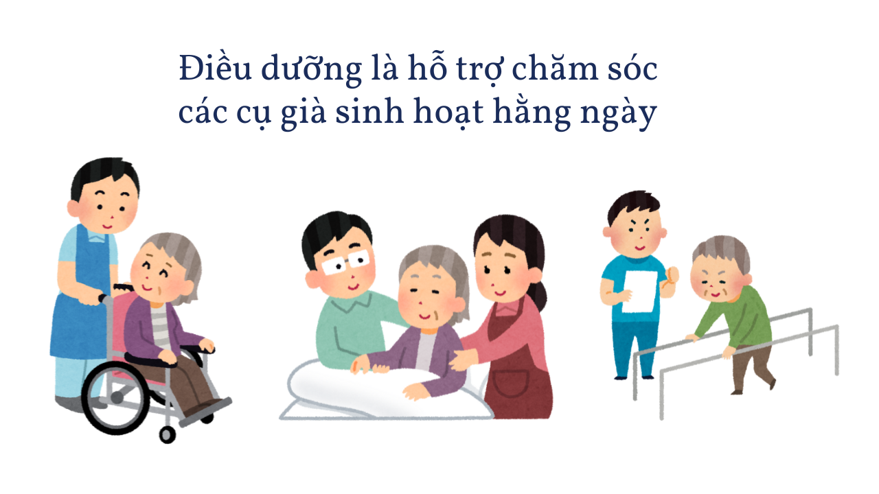 Tại Nhật, điều dưỡng là công việc chăm sóc, hỗ trợ người già bị suy giảm sức khỏe hoặc những người bị giới hạn khả năng hoạt động. Cụ thể công việc của một nhân viên điều dưỡng sẽ bao gồm: